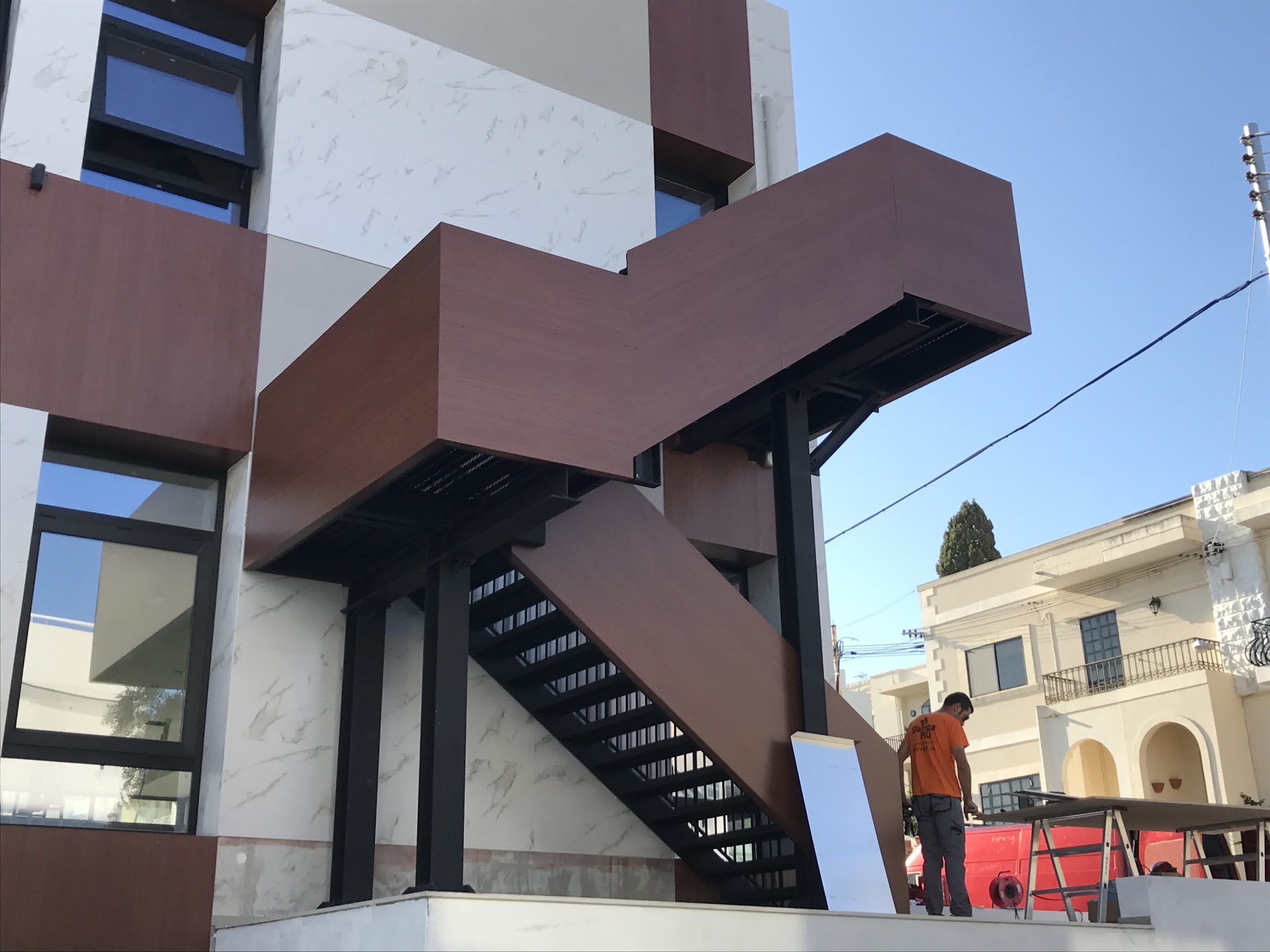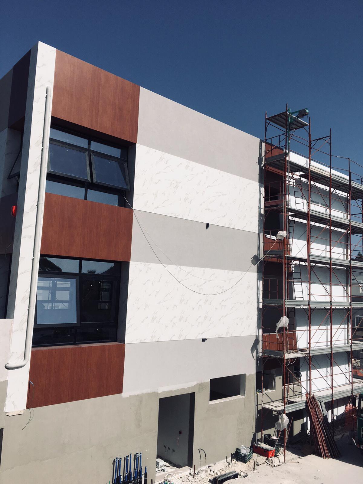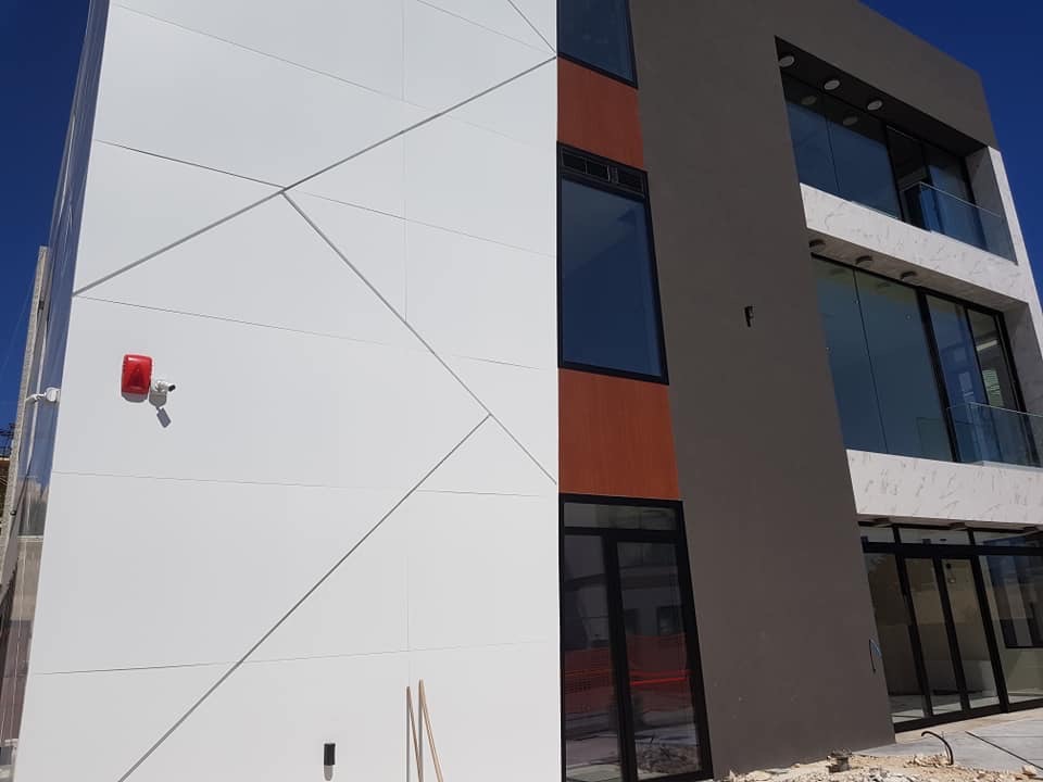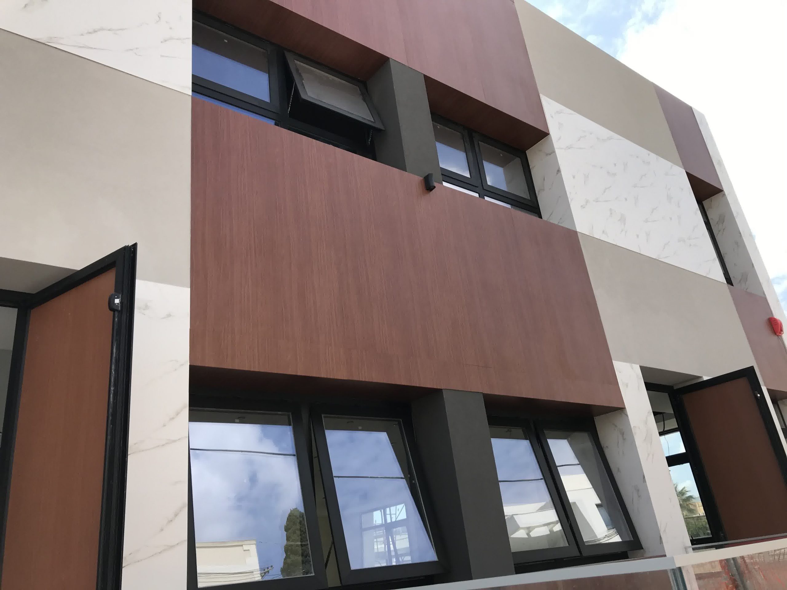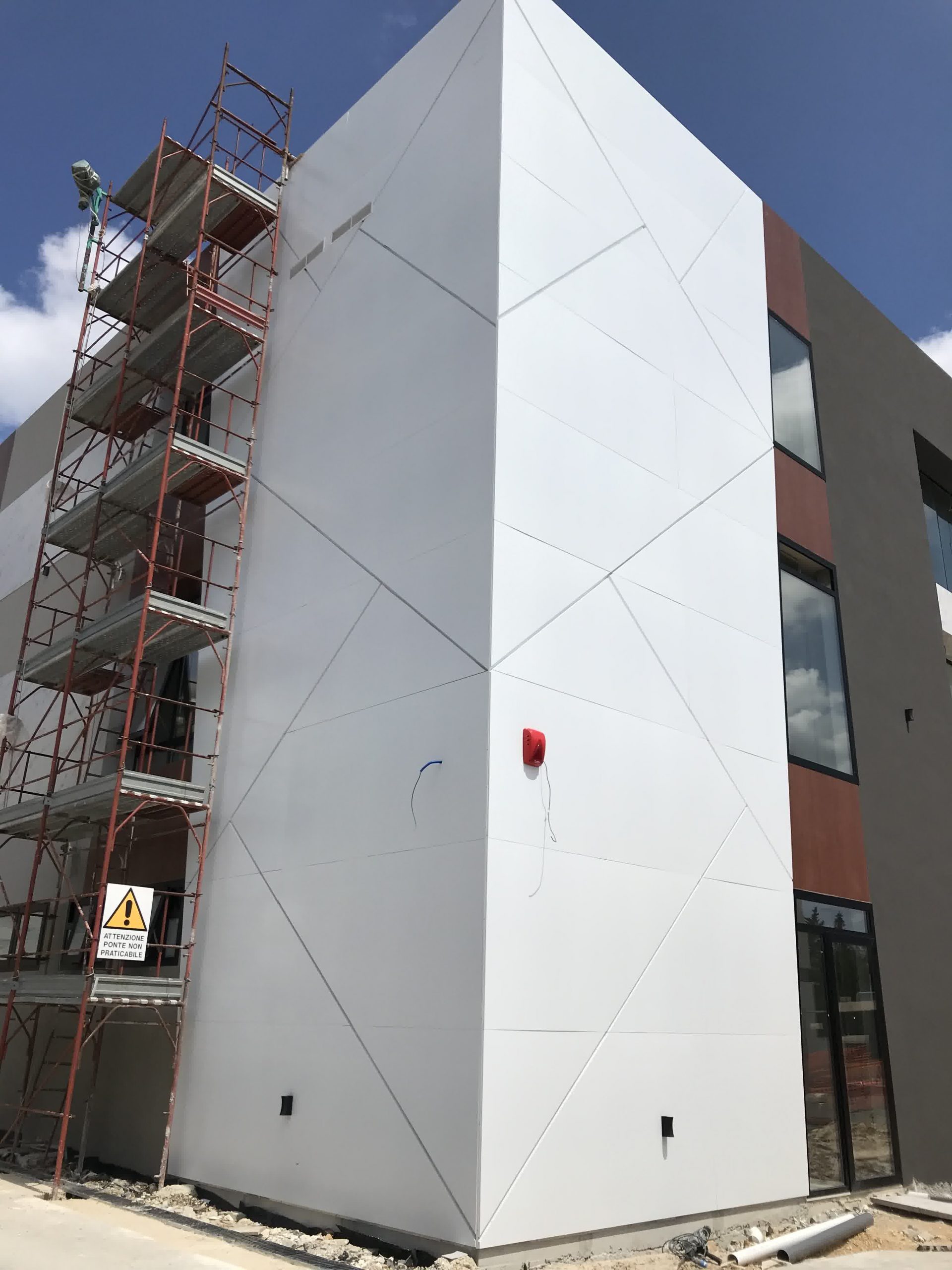 Rivestimento angolo palazzo 12×3 mt in alluminio composito bianco più elementi in effetto legno.