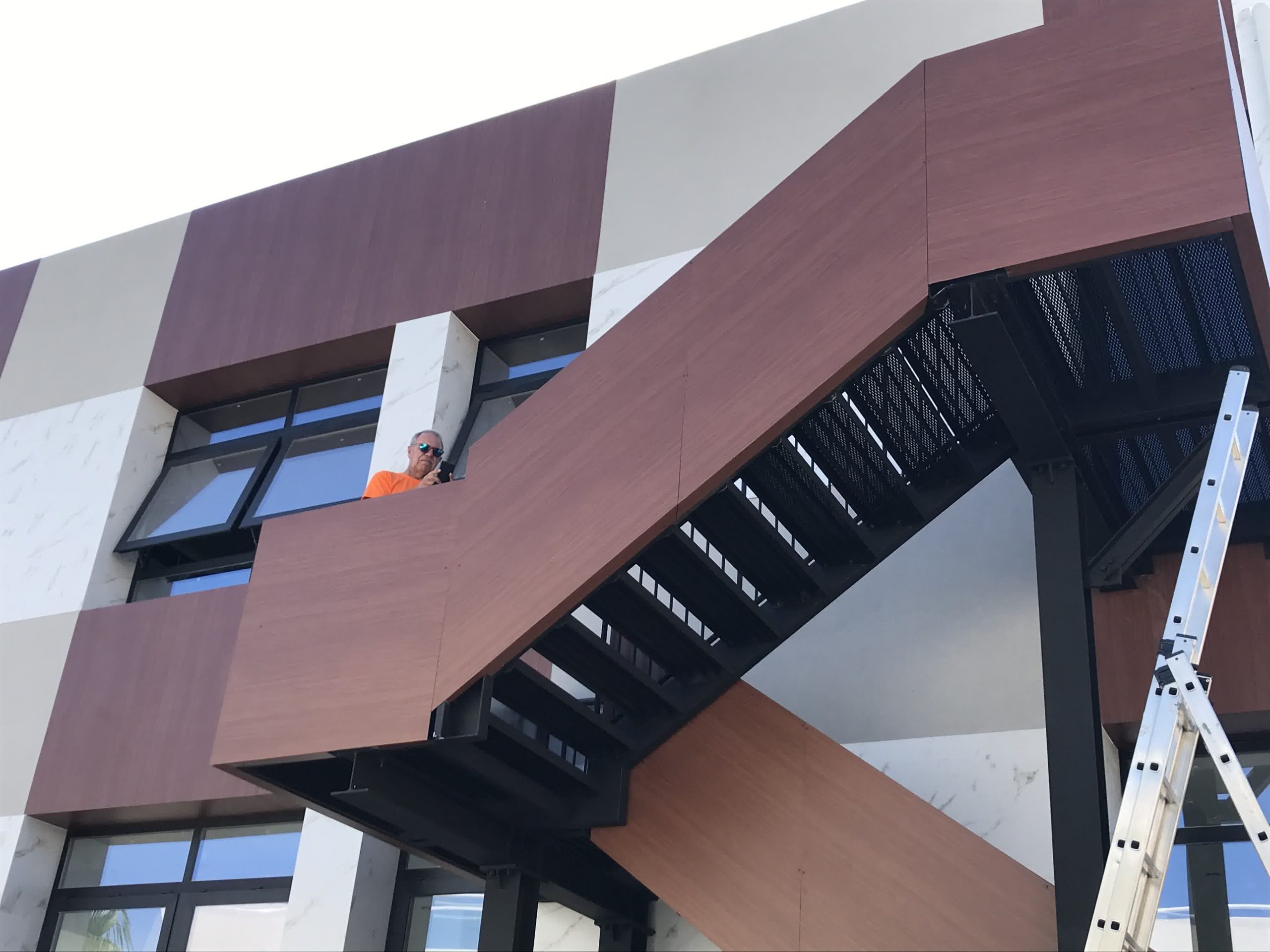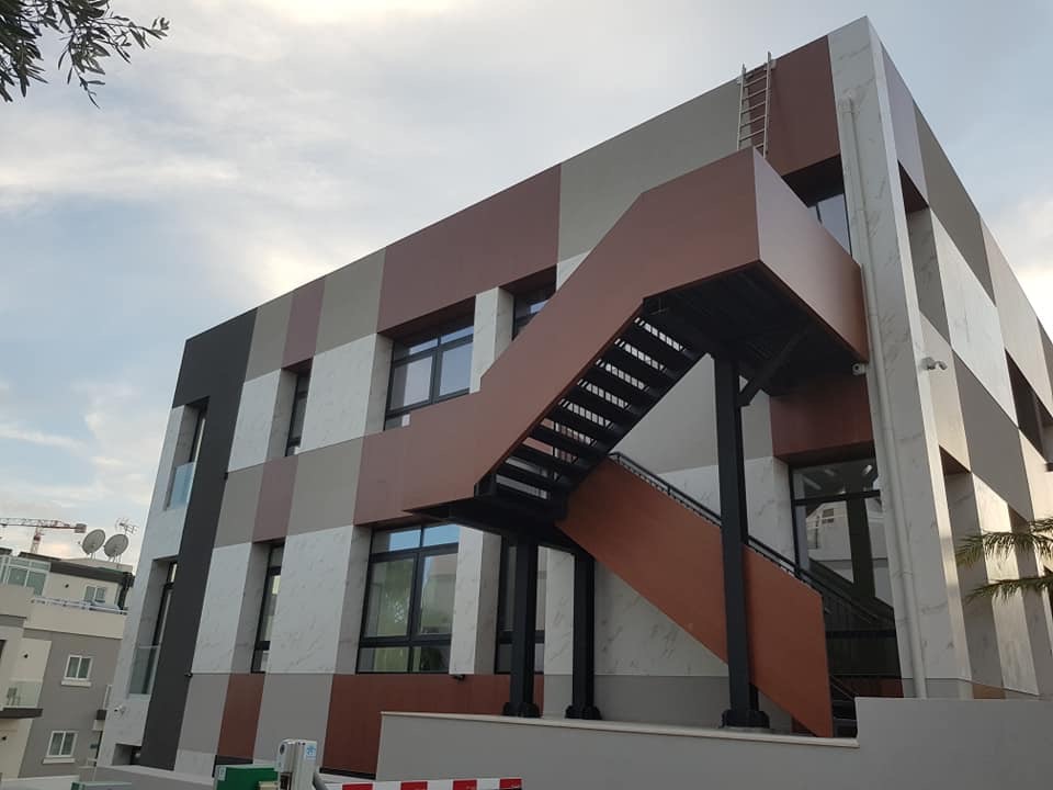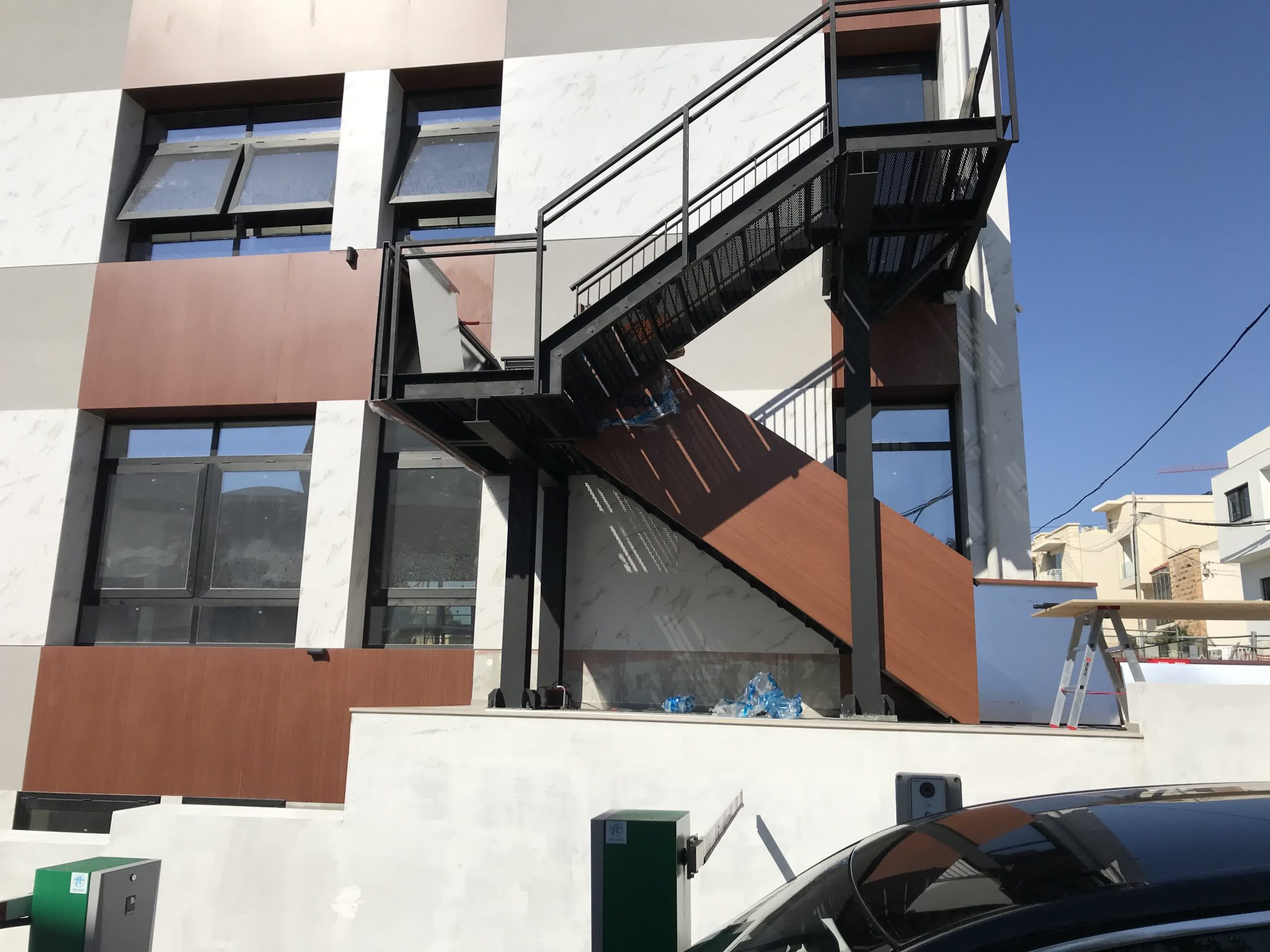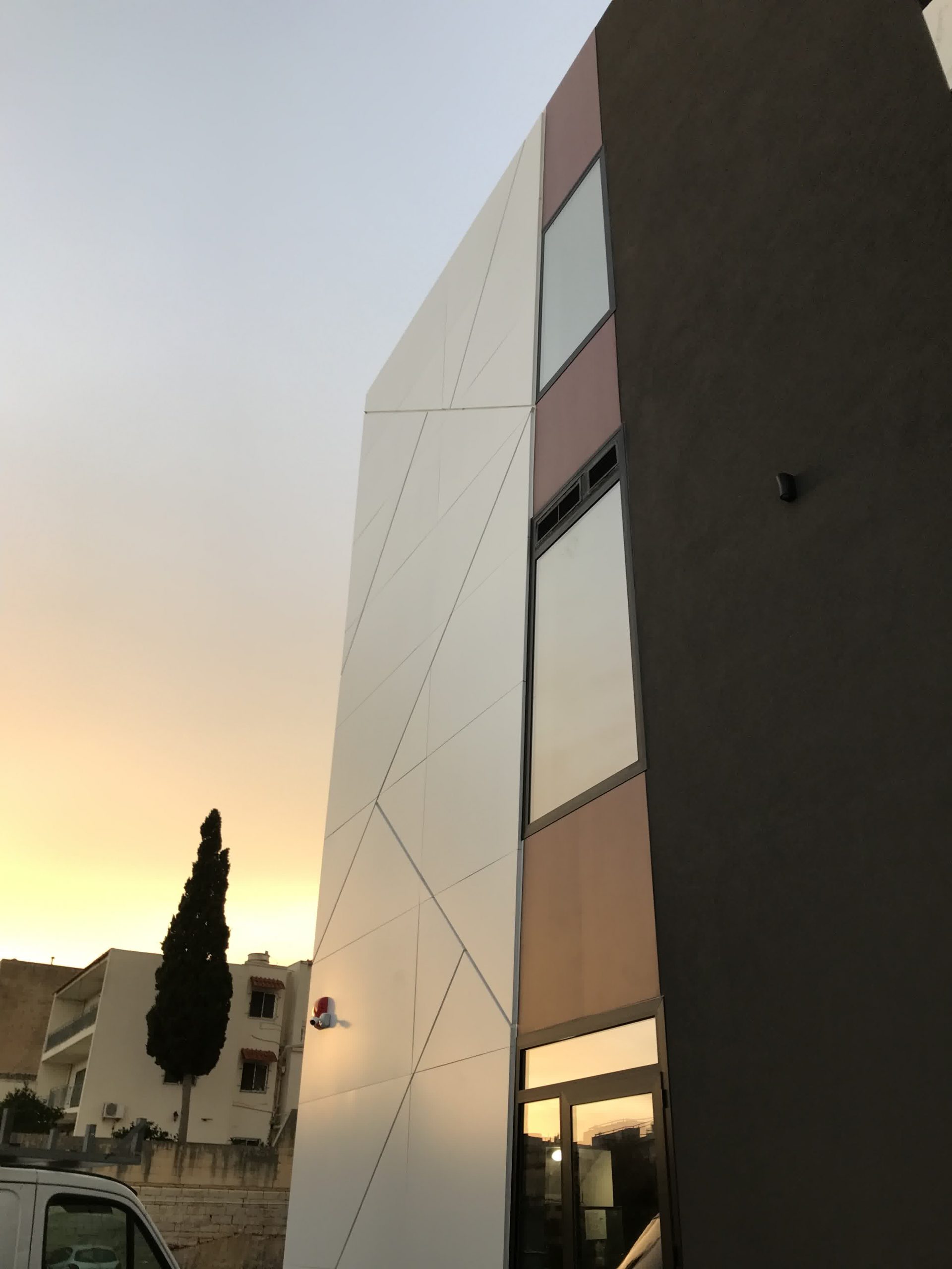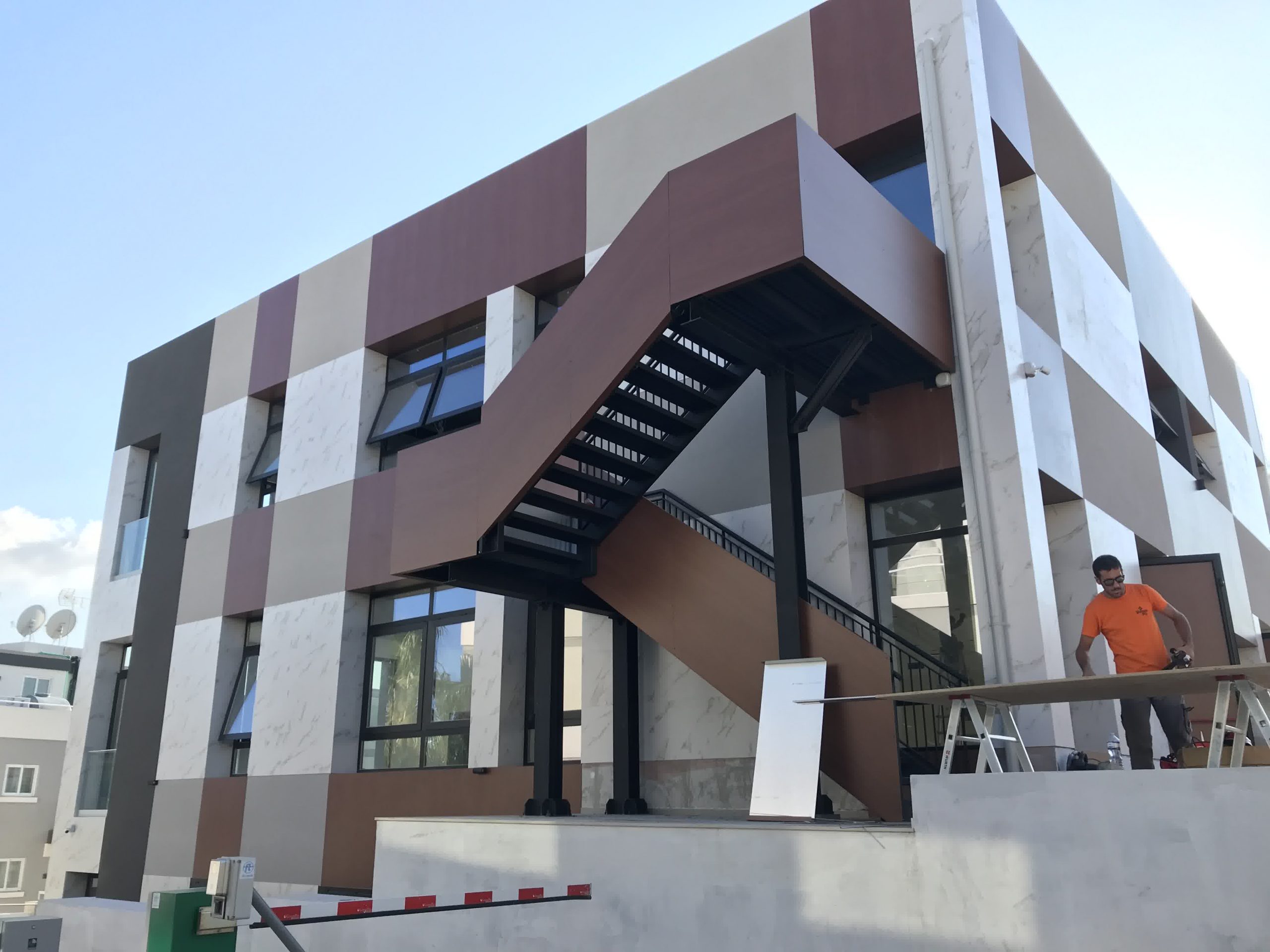 Rivestimento angolo palazzo 12×3 mt in alluminio composito bianco più elementi in effetto legno.