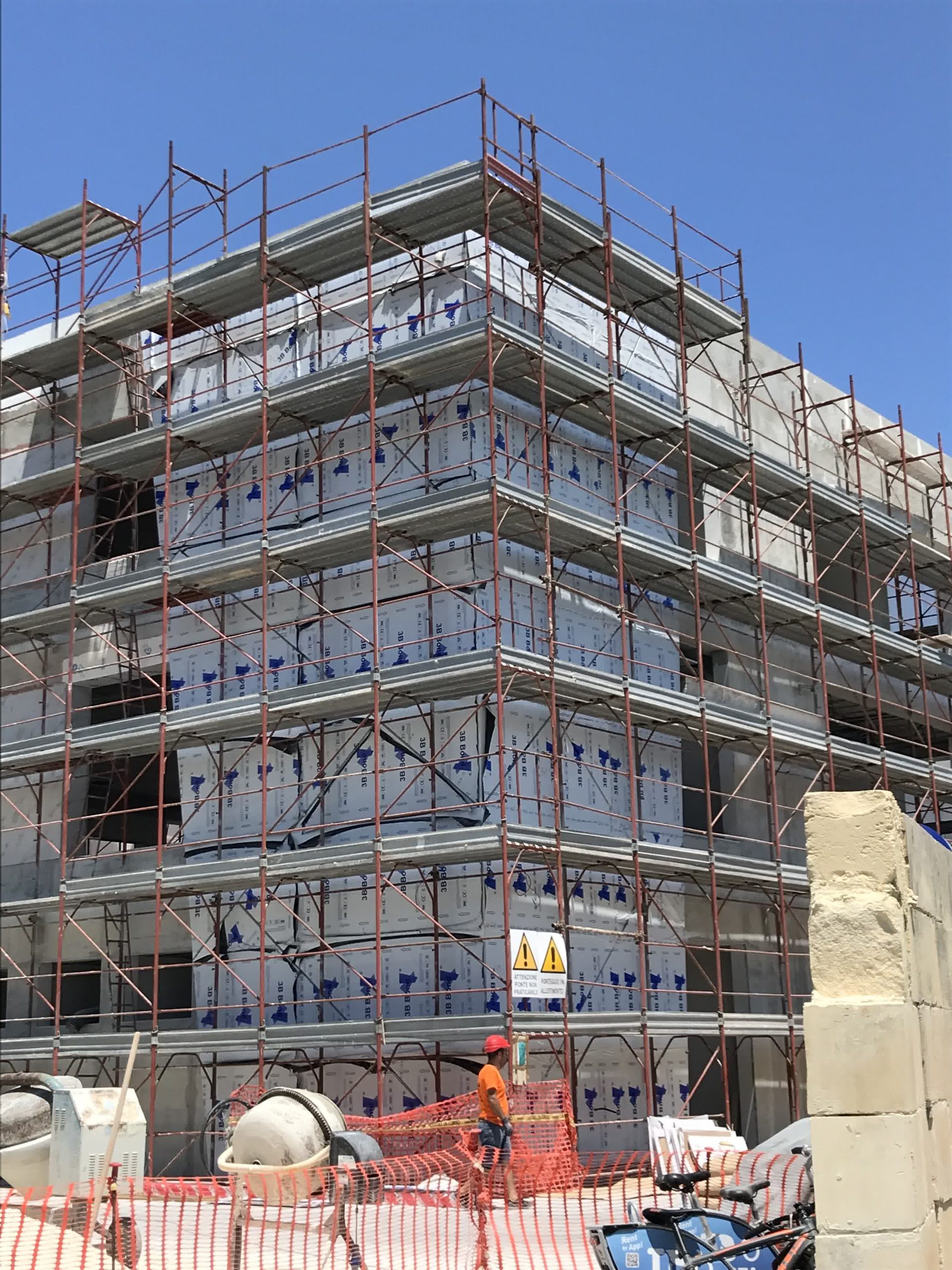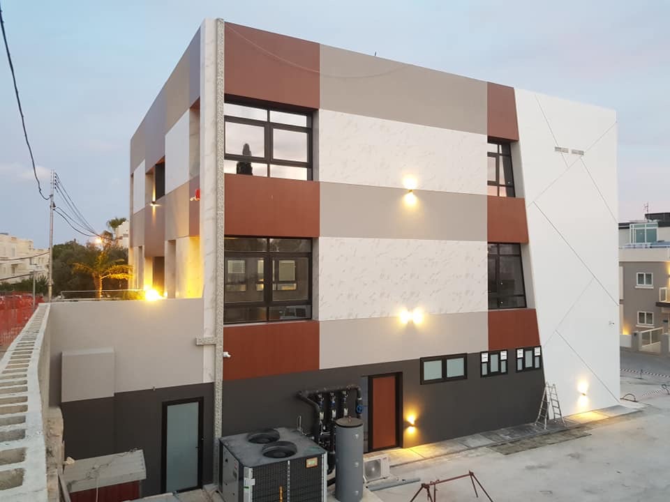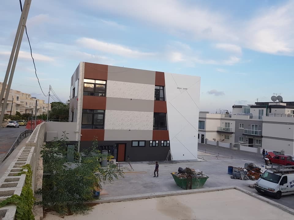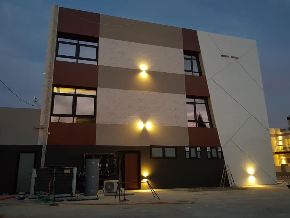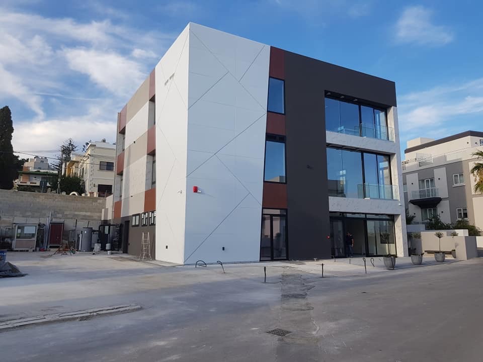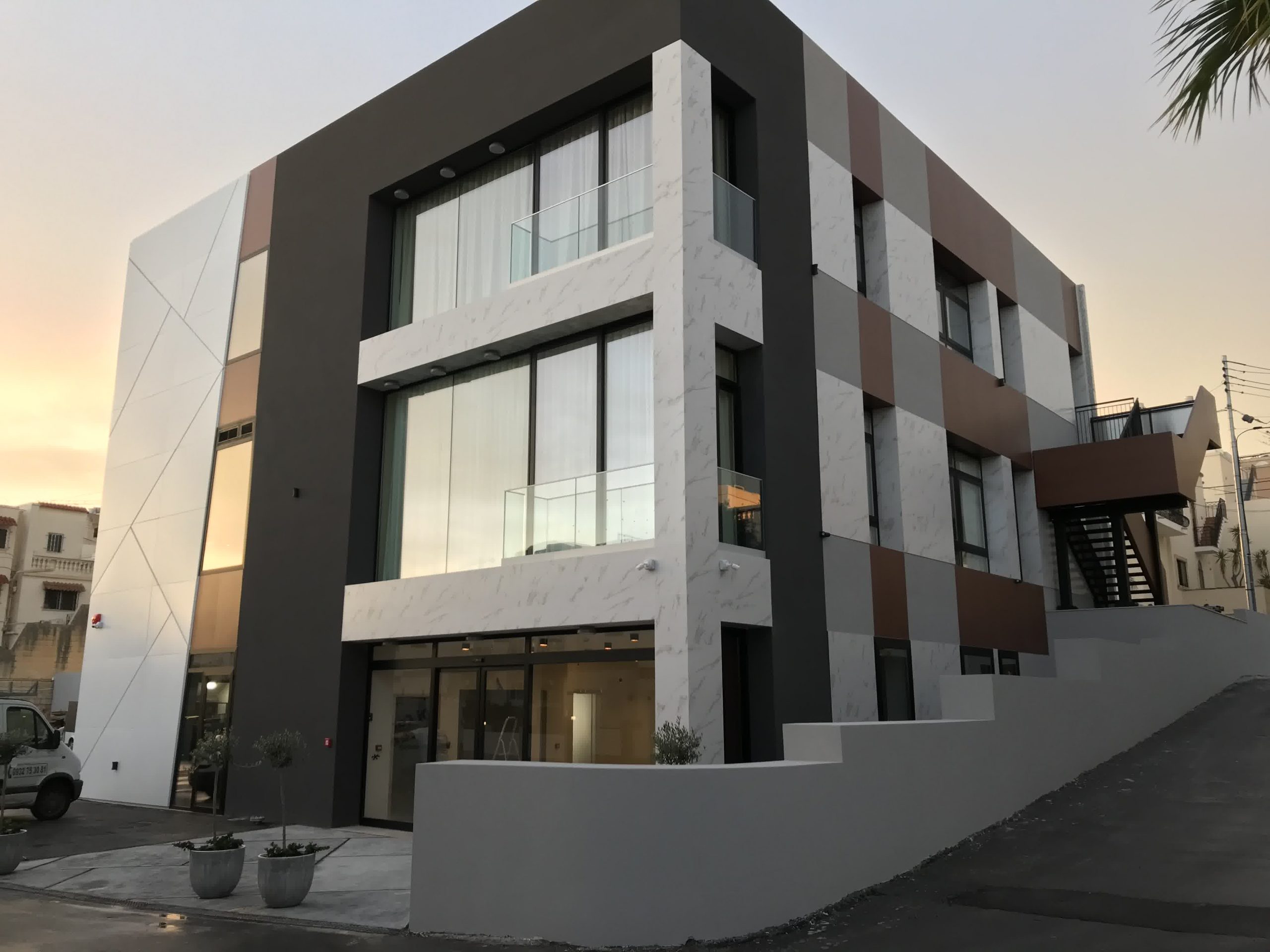 Rivestimento angolo palazzo 12×3 mt in alluminio composito bianco più elementi in effetto legno.